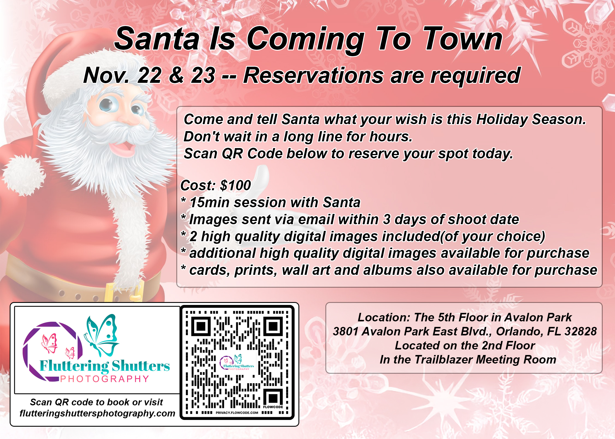 Skip the long lines this holiday season and book your magical 15-minute session with Santa! 🎄✨ Each session includes:• 15-minute private visit with Santa• 2 high-quality digital images of your choice (delivered within 3 days)• Option to purchase additional images, prints, wall art, and albums Cost: $100 per session