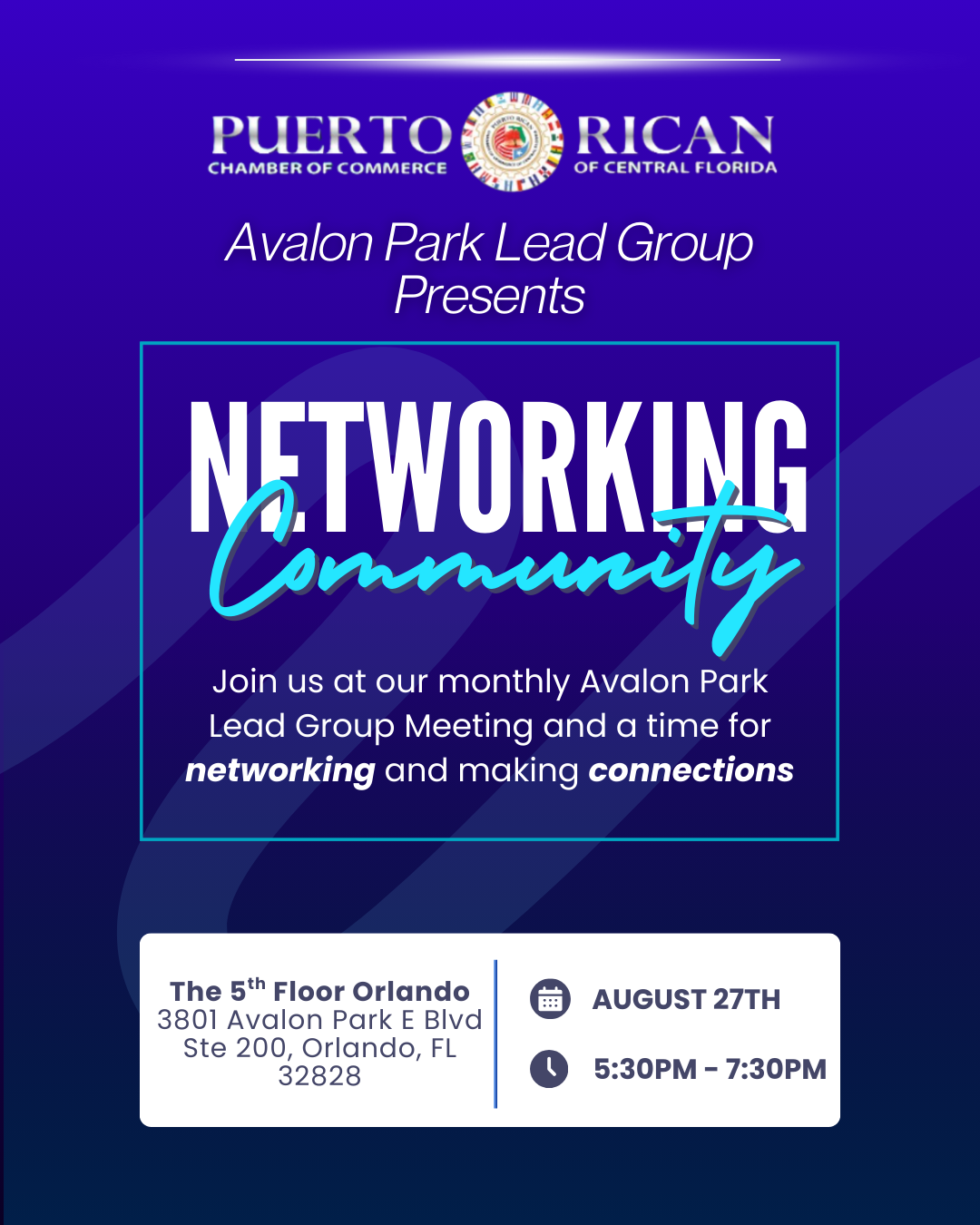 Join us at our monthly Avalon Park Lead Group Meeting, presented by the Puerto Rican Chamber of Commerce of Central Florida. This is a time for networking and making valuable connections with fellow professionals in our community.